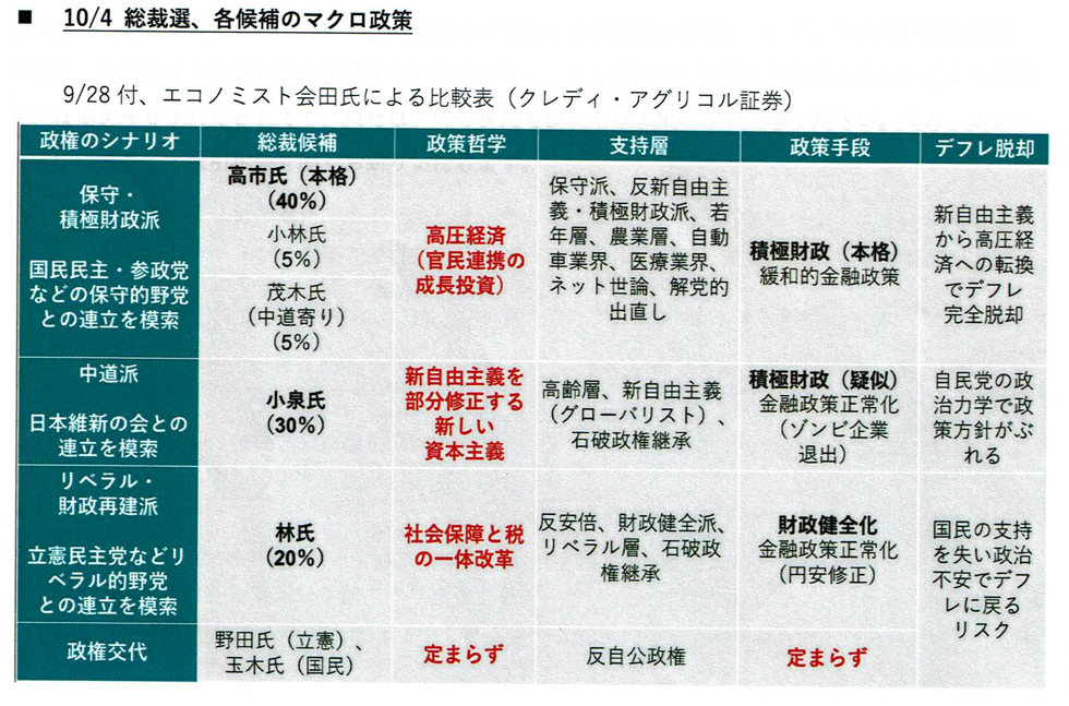 さて、自民総裁選である。マクロ政策は表の通り。高市氏が最有力とみている(これも大井幸子さんによる)。