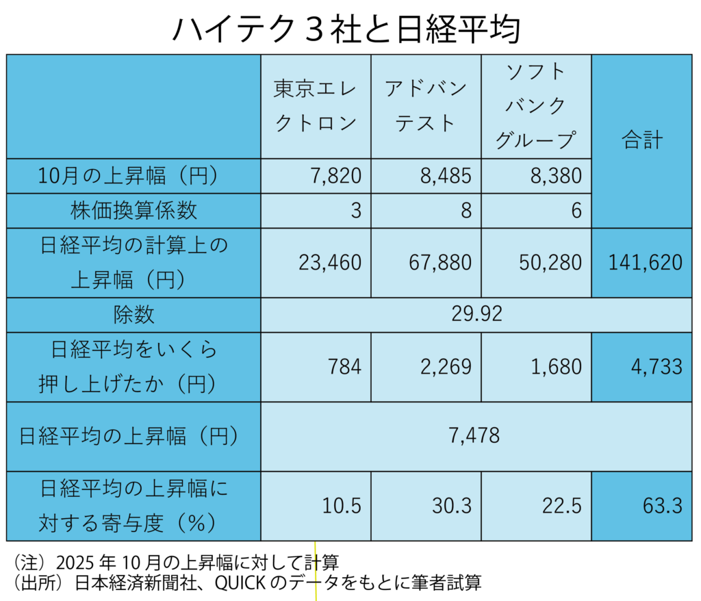 3つ目は10月の株高は高市トレードなどではなく、世界のハイテク株相場の流れに乗っているに過ぎないとの考え方です。実際、アドバンテスト、ソフトバンクグループ(SBG)、東京エレクトロンの3銘柄で、日経平均の1日の値動きの大半を説明できる日もありました。