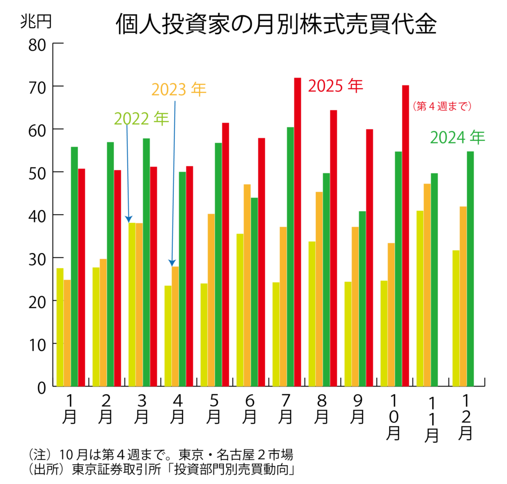 若年層の投資手法には危うさを感じることもありますが、大胆な分、株価形成にも影響を与えているようです。高市トレードの一角を担った結果、10月の個人投資家の株式売買代金は、1カ月の売買代金として過去最高になったもようです。(マーケットエッセンシャル主筆)