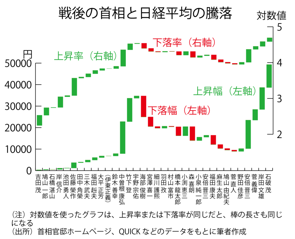 上昇幅でみるか、上昇率でみるかによって順位に差が出てきますが、往年の首相が不利にならないように上昇率でみることにすれば、ベストスリーは佐藤栄作、中曽根康弘、安倍晋三でした。通算在職日数は佐藤が2798日、中曽根が1806日、安倍が3188日でした。