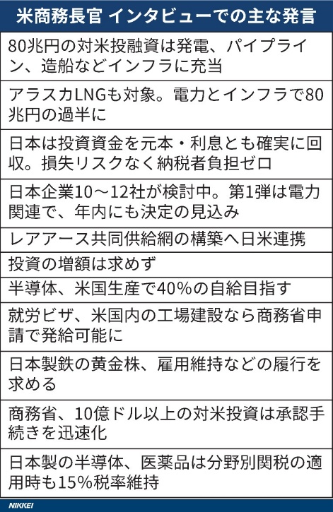 表は日経新聞10月28日朝刊のものだが、同紙は「日本の80兆円、米インフラに--まず電力分野」と報じた。同長官は日本の半導体の関税を「15%を維持する」と述べている。