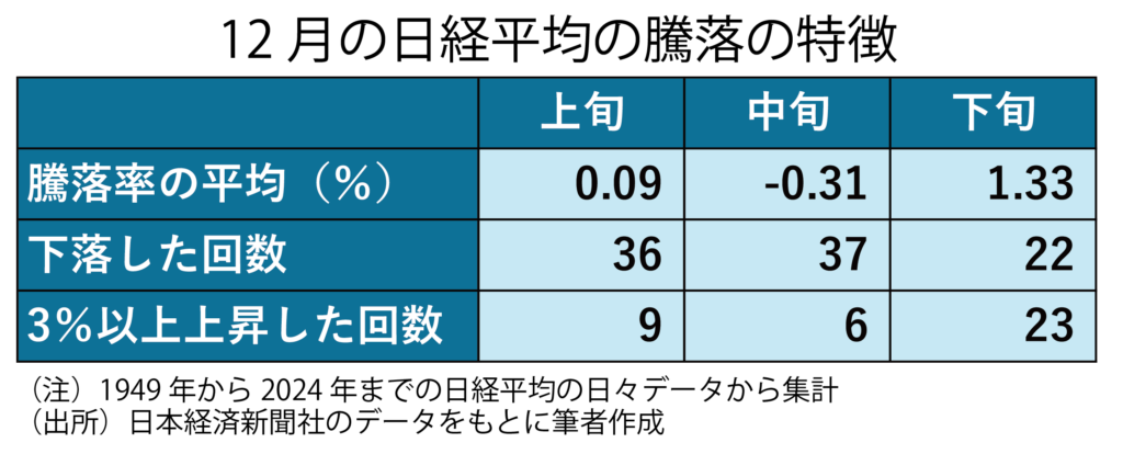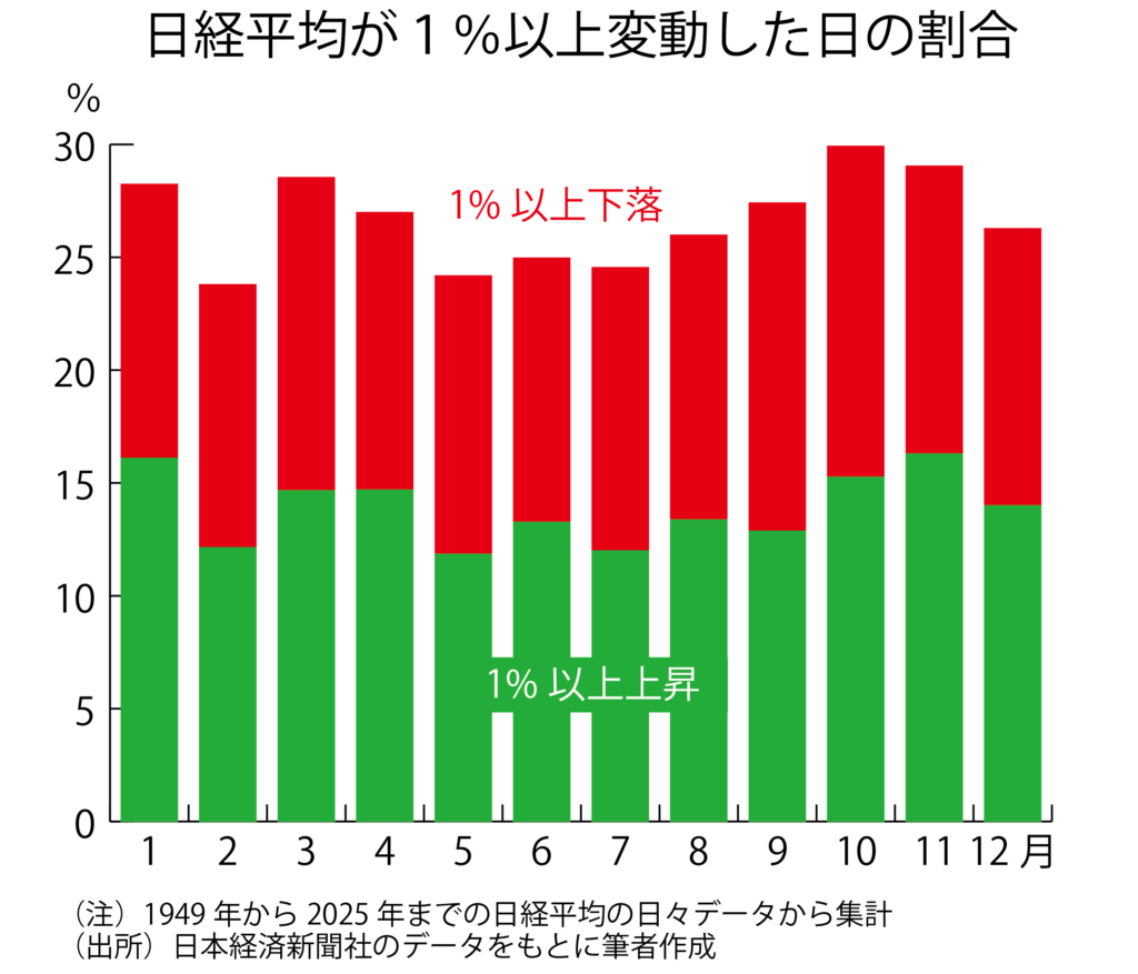 もっとも戦後の日経平均株価の日々の動きを振り返る限り、12月が特段、変動日が多かったわけではありません。1949年にさかのぼって調べると、営業日のうち、日経平均が1%以上変動した日の割合が大きかったのは10月の29・9%でした。12月は26・3%で12カ月中7番目。1%以上上昇した日だけに限っての割合も14・0%と、12カ月中の6番目でした。