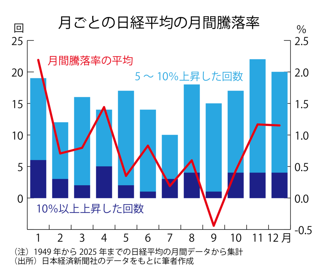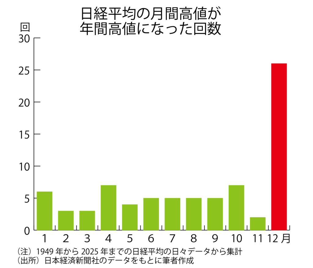 12月の日経平均の月間騰落率の平均は1・15%で、12カ月のなかでは1月の2・19%、4月の1・44%、11月の1・16%に次いで4番目でした。戦後に12月は76回ありましたが、上昇回数は48回で、12カ月中では4番目でした。ただ、このうち5%以上上昇した回数は20回と11月の22回に次いで多く、一応、「上昇しやすい月」と言えるかもしれません。