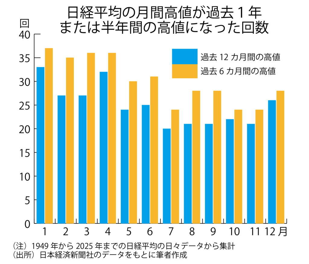 1949年以降の日経平均を振り返ると、12月の高値が1~12月あるいは7~12月の高値になった回数はそれぞれ26回と28回でした。ただ12月は最良の月ではありませんでした。1月の高値が前年2月から1月にかけての高値になった回数は33回、前年8月から1月にかけての高値になった回数は37回で、これが12カ月のうちのベストでした。