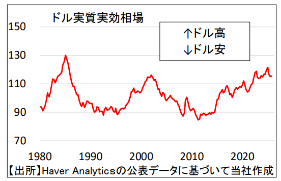 2024 年のトランプ第二次政権の発足以降、国際政治と国際経済の世界で最大の論点となったのは、米国の覇権が安定するのか、毀損するのかという点である。リベラルな論調が主流の主要メディアでは、同盟国への防衛費負担の押付けや自傷行為であるトランプ関税などにより米国への信頼が損なわれ、覇権の毀損に繋がるとの見方が多かった。その際、引き合いに出されたのがドル安だ。しかし、この見方は事実誤認だ。左図のように実質実効ドル相場は高値圏での小反落にとどまっている。米国株価も史上最高値圏にある。中でも、AI 革命期待から AI 関連株が、防衛政策への期待から防衛株などが高騰している。背景にあるのは、トランプ政権主導の覇権を強化する政策だ。具体的には、AI 政策は「米国 AI 行動計画」や「ジェネシス・ミッション」、防衛政策は「力による平和」を標榜する「国家安全保障戦略」などが挙げられる。他にも半導体企業やレアアース企業への政府出資など、覇権の強化を国家資本主義で着実に進めている。」(黒瀬リポートより)