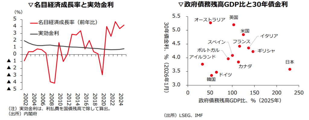 「消費税減税をめぐっては、高市総裁は選挙後に国民会議で検討を加速すると発言しており、実現するかは今後の議論の動向を見守る必要がある。一方で、高市政権の財政政策は、引き続き「責任ある積極財政」のもとで政府債務残高GDP比の引き下げを重視していくと想定される。政府債務残高GDP比は、名目経済成長率が名目金利を上回る条件のもとでは一定の財政赤字の下でも抑制可能という考えがある。税収増が国債費を上回る蓋然性が高まるためで、実際、近年ではインフレ率の高止まりを主因に名目経済成長率が名目金利を上回り、政府債務残高GDP比は低下している。